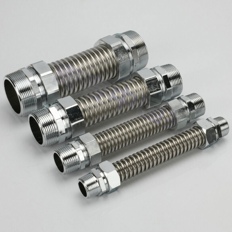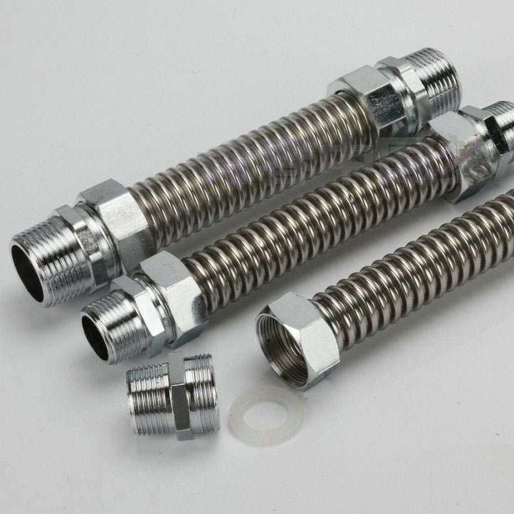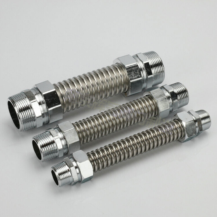 由不锈钢波纹管与钢或铜制管路连接件扣压而成。具有耐高压、弹性好、偏转位量大、耐老化、耐温,安装方便。适用于空调风机盘管的出口管路柔性连接